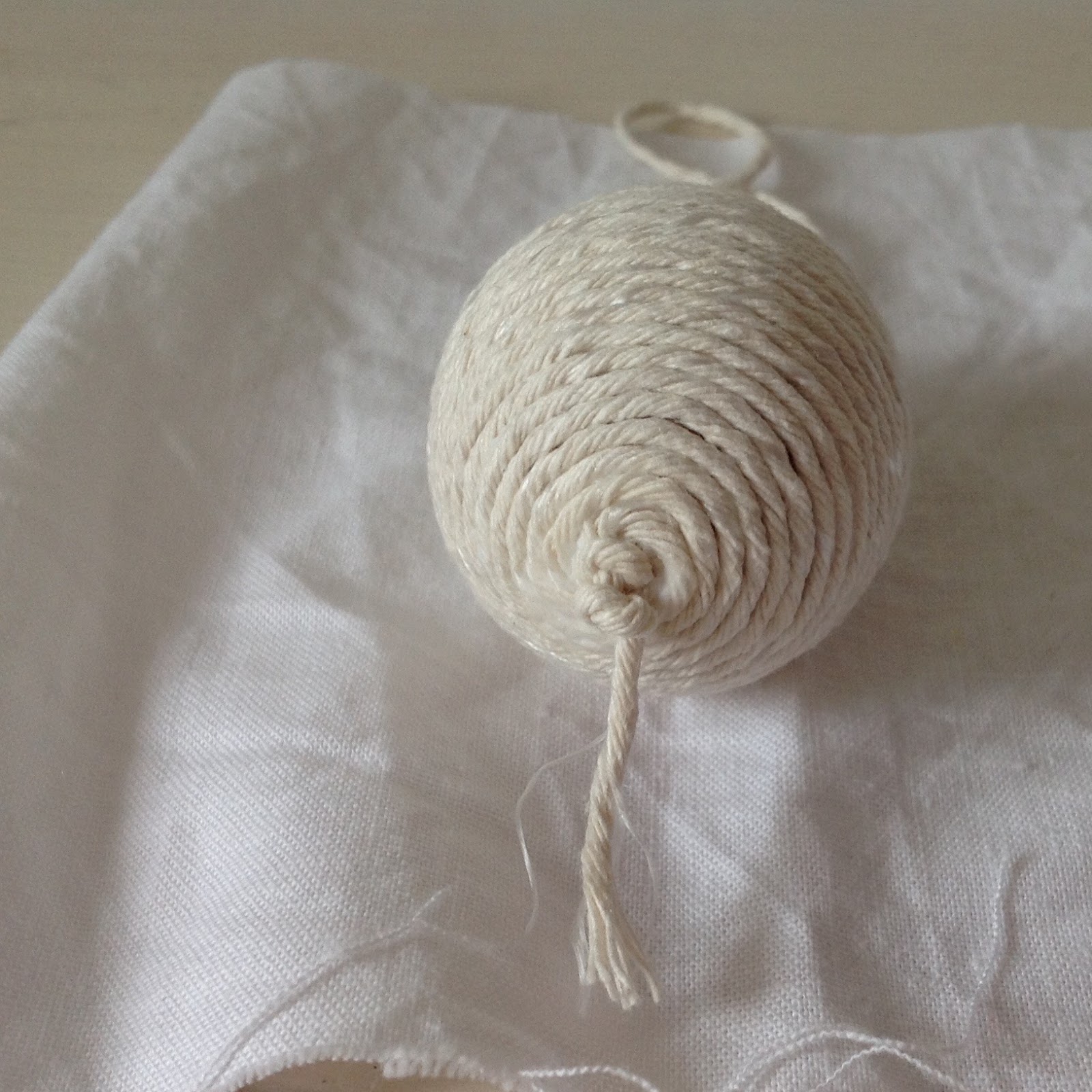 Użyłam kleju Magic (wikol też się sprawdzi), bawełnianego sznurka i nieco cierpliwości. Na początku usadowiłam pętelkę z supełkiem z jednej strony wydmuszki (w dziurce, która powstała przy wydmuchiwaniu jajka). Nałożyłam wokół niej sporo kleju i zaczęłam oplatać jajo sznurkiem smarując stopniowo klejem. Można ułatwić sobie pracę rozpoczynając klejem na gorąco. Szybko złapie pętelkę i początek sznurka. Później nie polecam, bo potrzeba trochę precyzji i szybka praca z tym klejem nie będzie sprzyjała dokładności.